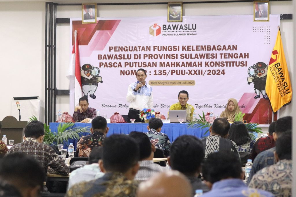 Poso, Bawaslu Sulteng – Anggota Bawaslu Provinsi Sulawesi Tengah, Rasyidi Bakry, menekankan pentingnya memanfaatkan masa pasca pemilu sebagai momentum strategis untuk memperkuat kelembagaan Bawaslu. Hal itu ia sampaikan saat membawakan materi bertajuk "Menakar Peran Ideal Bawaslu Pasca Pemilu 2024" dalam kegiatan Penguatan Fungsi Kelembagaan yang digelar di Hotel Ancyra, Kabupaten Poso, Selasa (29/07/2025).