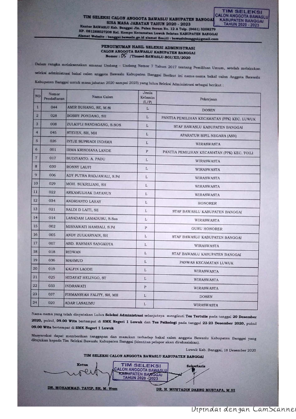 Dalam Rangka Melaksanakan Amanat Undang-Undang Nomor 7 Tahun 2017 tentang Pemilihan Umum, setelah melakukan seleksi administrasi Bakal Calon Anggota Bawaslu Kabupaten Banggai. Berikut ini Nama-nama Bakal calon Anggota Bawaslu Kabupaten Banggai untuk masa jabatan 2020-2023 yang lulus administrasi sebagai berikut: