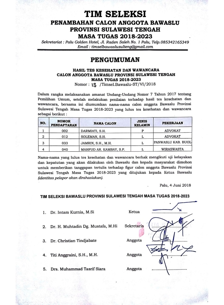 Palu, BAWASLU SULTENG - Dalam rangka melaksanakan amanat Undang-Undang Nomor 7 Tahun 2017 tentang Pemilihan Umum, setelah melakukan penilaian terhadap hasil tes kesehatan dan wawancara, bersama ini diumumkan nama-nama calon anggota Bawaslu Provinsi Sulawesi Tengah Masa Tugas 2018-2023 yang lulus tes kesehatan dan wawancara sebagai berikut :