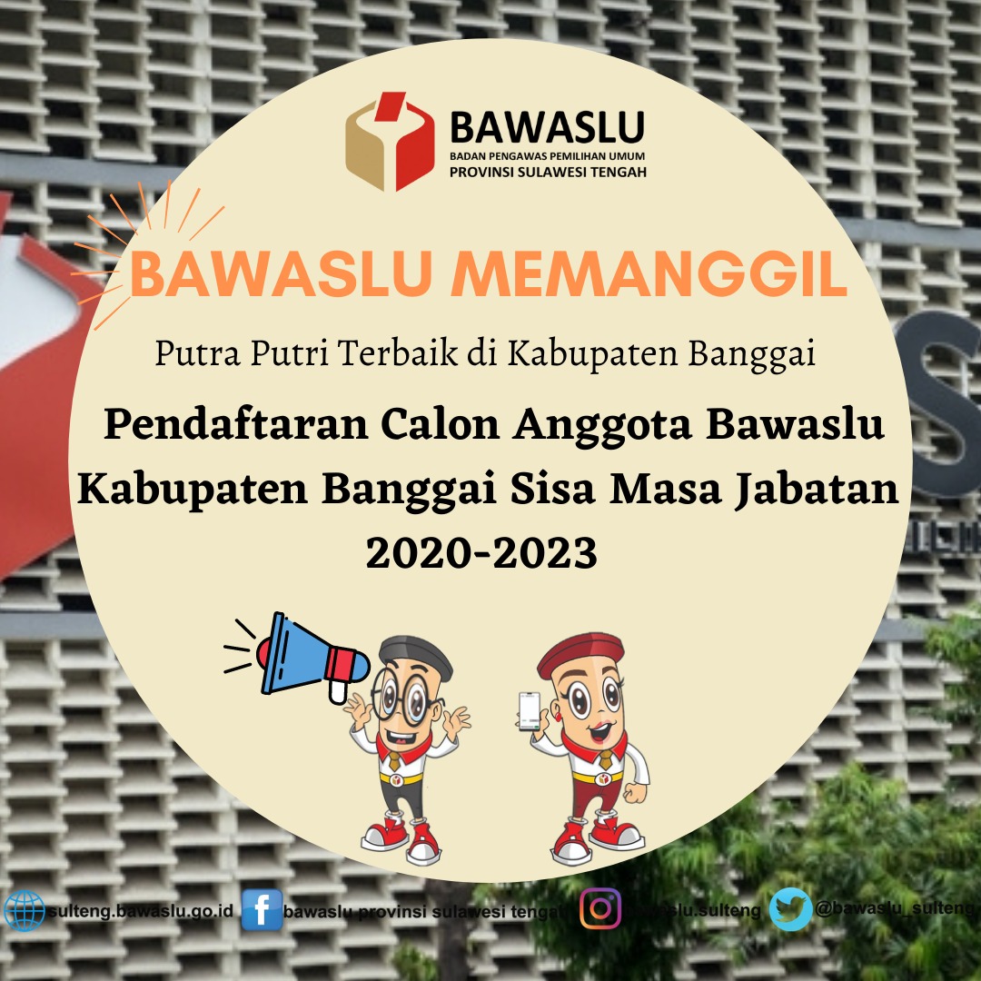 Luwuk, Bawaslu Sulteng - Dalam rangka seleksi Calon Anggota Badan Pengawas Pemilihan Umum (BAWASLU) Kabupaten Banggai sisa masa jabatan 2020-2023, maka Tim Seleksi Calon Anggota Bawaslu Kabupaten Banggai sisa masa jabatan 2020-2023 berdasarkan keputusan Bawaslu RI Nomor : 0397.A/K.BAWASLU/HK. 01.01/XI/2020 Tanggal, 23 Nopember 2020 Tentang Penetapan Tim Seleksi Calon Anggota Bawaslu Kabupaten Banggai, dan Surat Keputusan Ketua Badan Pengawas Pemilihan Umum Nomor : 0408/K/BAWASLU/HK. 01.00/XI/2020 Tanggal, 30 Nopember 2020 tentang Pedoman Pelaksanaan Pembentukan Badan Pengawas Pemilihan Umum Kabupaten Banggai, maka atas kewenangan yang dimiliki, kami membuka kesempatan bagi Warga Negara Indonesia yang memenuhi persyaratan untuk mendaftarkan diri sebagai Calon Anggota Bawaslu Kabupaten Banggai Sisa Masa jabatan 2020-2023.