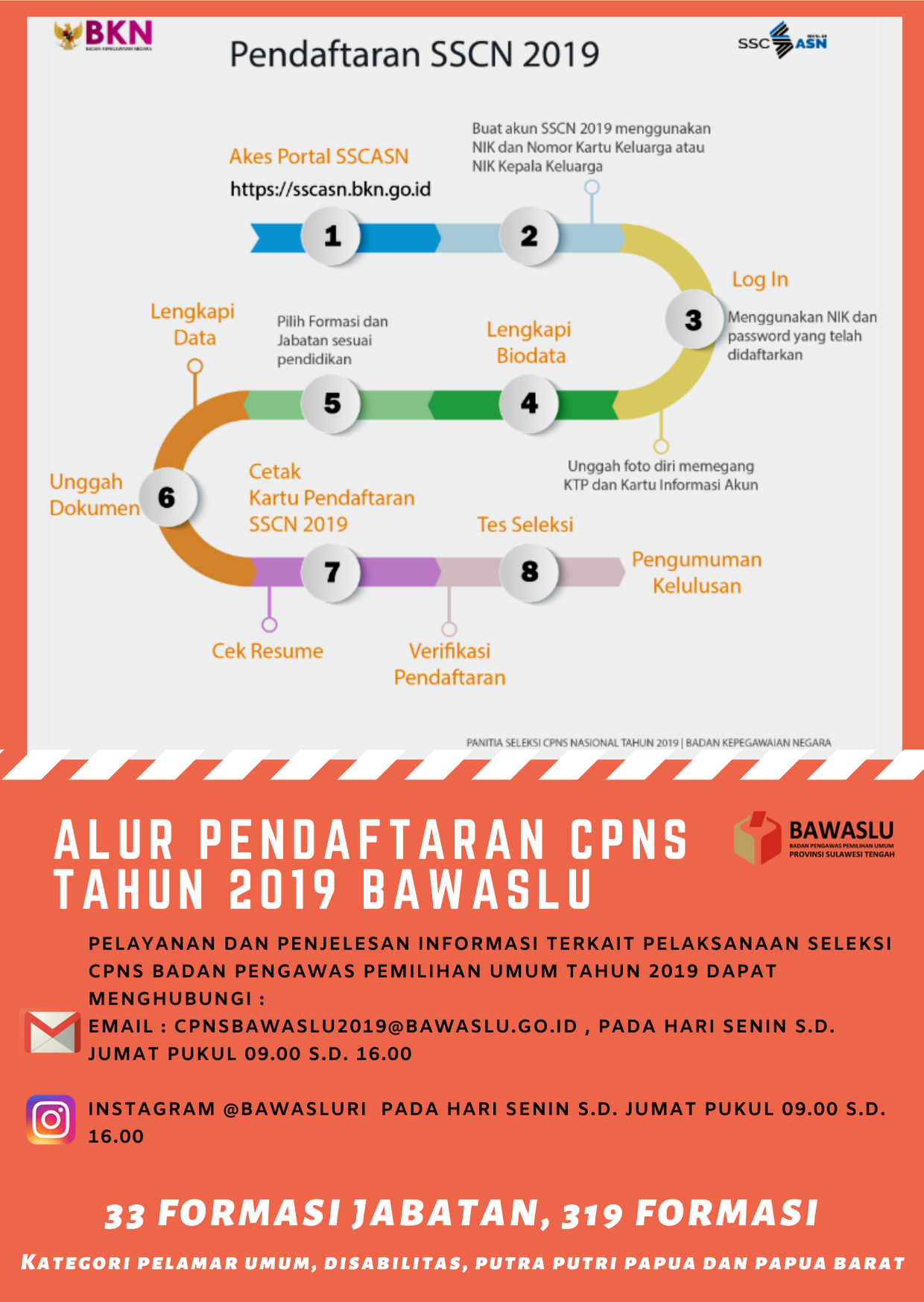 Badan Pengawas Pemilihan Umum berdasarkan Keputusan Menteri Pendayagunaan Aparatur Negara dan Reformasi Birokrasi Nomor 683 Tahun 2019 tentang Penetapan Kebutuhan Pegawai Aparatur Sipil Negara di Lingkungan Badan Pengawas Pemilihan Umum Tahun Anggaran 2019, membuka kesempatan kepada Warga Negara Indonesia putra-putri terbaik Indonesia lulusan Sarjana Strata 2 (S-2)/Sarjana Strata 1 (S-1)/Diploma IV (D-IV) untuk menjadi Calon Pegawai Negeri Sipil (CPNS) di Lingkungan Badan Pengawas Pemilihan Umum Tahun Anggaran 2019.